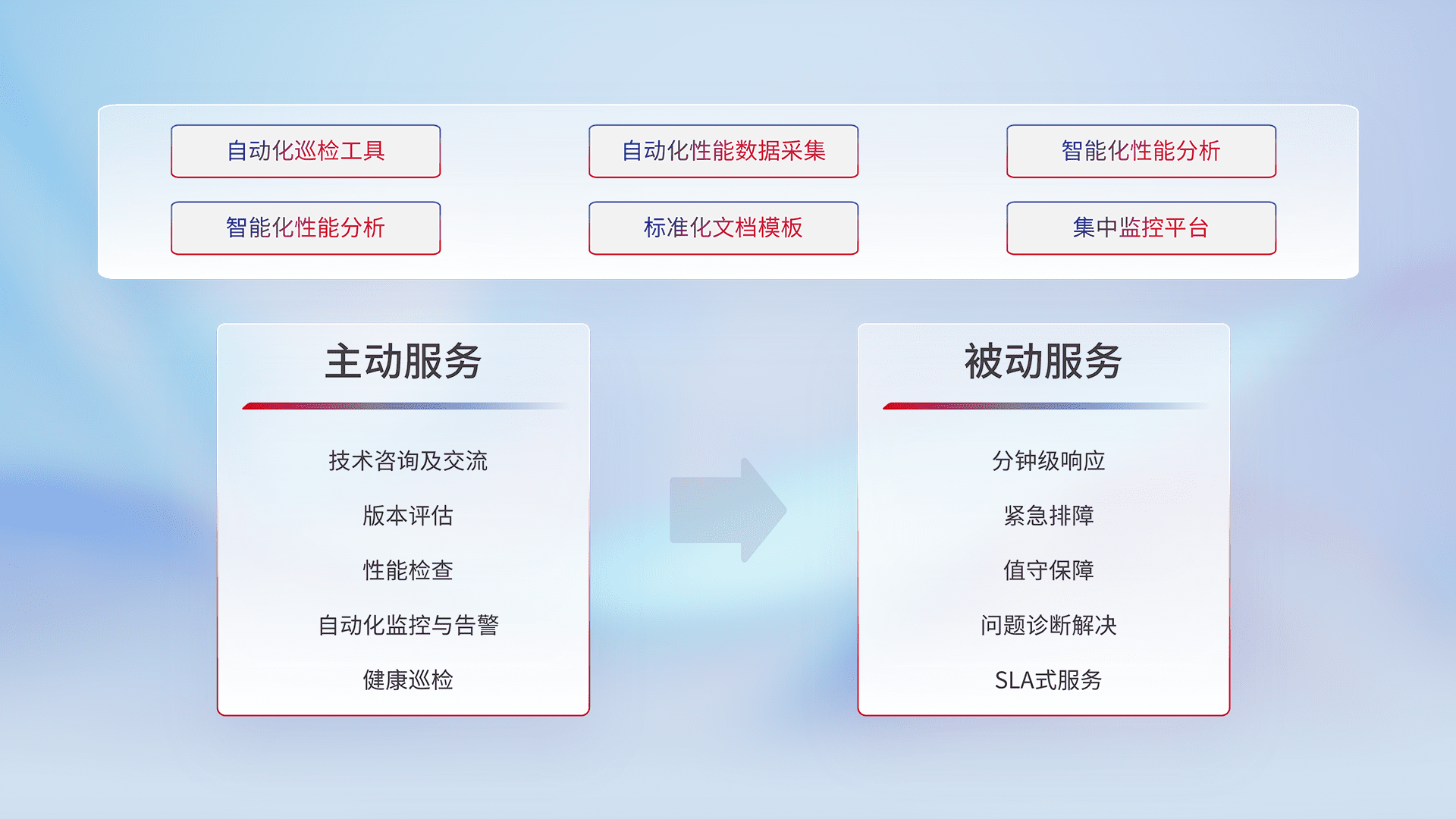 智能化工具和标准化文档,,保障服务质量,,,提供主动服务(包含技术咨询、、、、版本评估、、、、性能检查、、、、自动化监控与告警、、、健康巡检)和被动服务包含(分钟级响应、、、紧急排障、、值守保障、、、问题诊断解决、、、、SLA服务)。。。